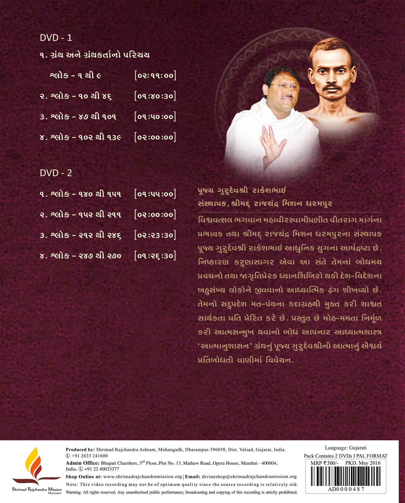 Pujya Gurudevshri chose the sacred text - Atmanushasan, by Acharyashri Gunbhadraswami, as the subject for the Paryushan Parva of the year 2003. Pujya Gurudevshri's elucidation on the 270 shloks of this holy scripture, teaches a true aspirant the art of breaking free from the clutches of delusion and thus gaining mastery over himself. A product comprising 8 priceless discourses by Pujya Gurudevshri, are available on sale, along with a pdf booklet of the shloks from the scripture.