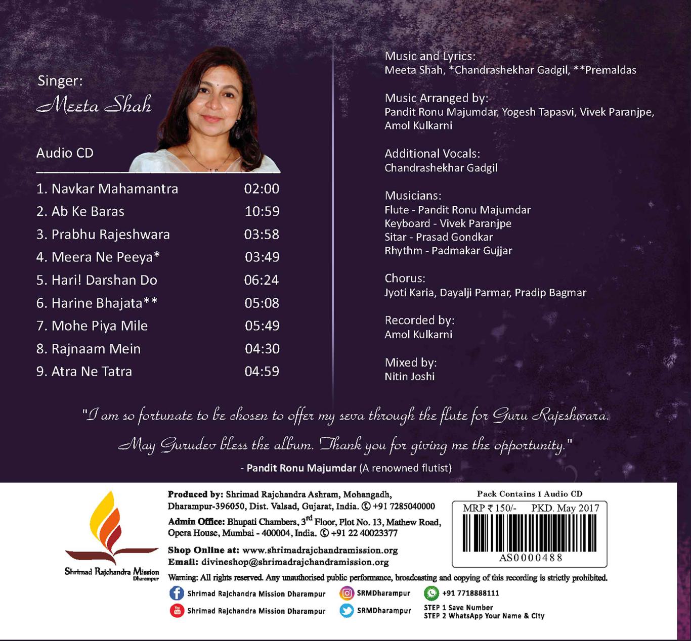 On the auspicious occasion of the Bhagavad Gita Poornahuti Mahotsav 2009, Shrimad Rajchandra Ashram launched an Audio set, named - 'Prabhuta - Binding with the Boundless' - comprising of a collection of 9 devotional tracks sung by Meetaben Shah accompanied by the renowned flutist, Pandit Ronu Majumdar. The devotional songs resonate the divine experience of boundless love for the great Lord. A moment yet again to evolve our souls to the fine tunes of a devotional rendezvous.